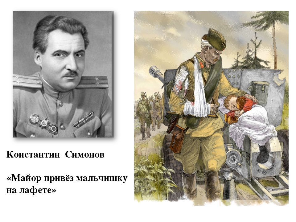Отец был ранен, и разбита пушка. Привязанный к щиту, чтоб не упал, Прижав к груди заснувшую игрушку, Седой мальчишка на лафете спал. (К. Симонов).